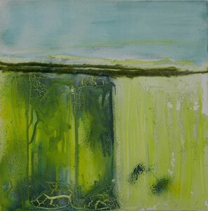 2018Abstracte weergave van architectuur en groen opgesloten in een vierkant. Gevoelsmatig de kloostertuin waar Van Gogh verbleef. Het werk zit in een houten grijsgroene baklijst, een van de kleuren in het schilderij.