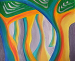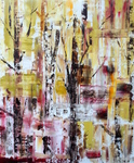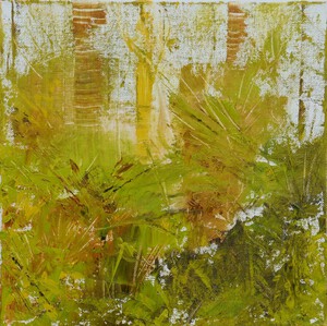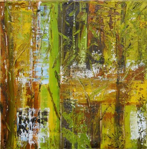 2017Geabstraheerd bos op canvasboard. Het werk zit in een bruine, baklijst. Een van de kleuren van het schilderij.