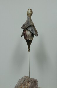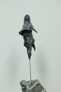 2022Beeld en stenen sokkel zijn samen 54 cm hoog. In navolging van haar serie ‘Moving earth’ heeft Trudie een serie ‘People in motion’ gemaakt, waarbij de menselijke vorm in meer of mindere mate herkenbaar en hun last voelbaar is. Het zijn stille getuigen van wat er op dit moment in de wereld gaande is: op de vlucht voor ellende, tevens op weg naar een betere toekomst.